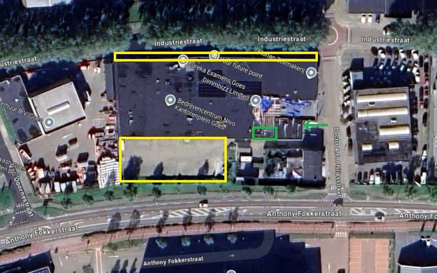 Gratis parkeren in de gele vakken. De ingang bevindt zich bij de groene pijl: